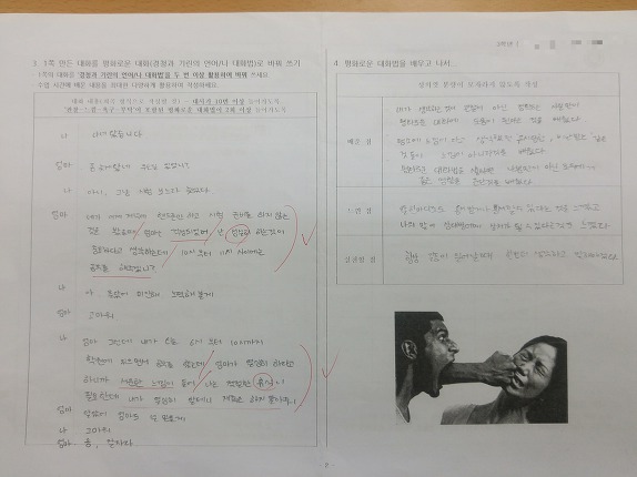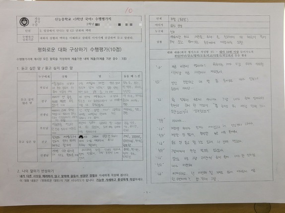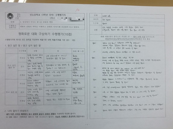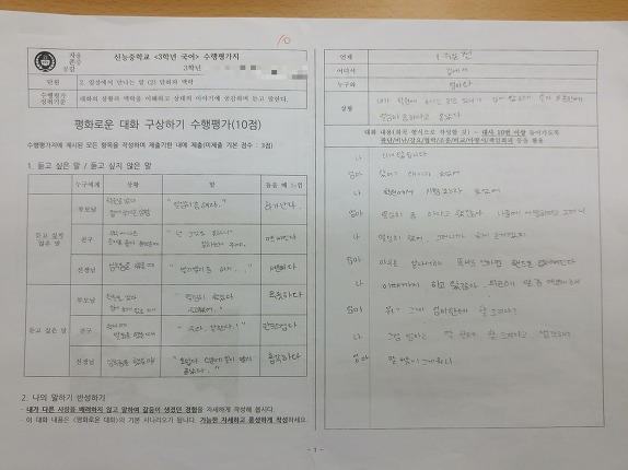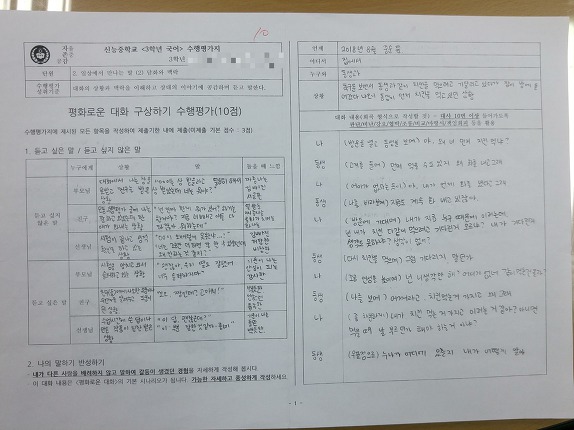 여러 시간에 걸쳐 배운 비폭력대화를 활용하여 평화로운 대화 구상하기 수행평가를 실시했습니다.