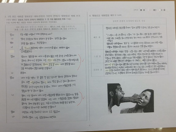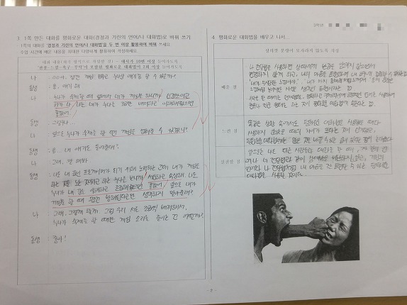 우선 자신의 말하기 방식을 반성하고 자신이 겪은 갈등 상황을 시나리오 형태로 만든 후, 비폭력대화 방법을 이용하여 평화로운 대화로 바꿔보는 활동입니다.