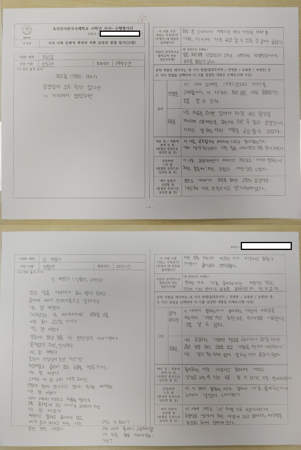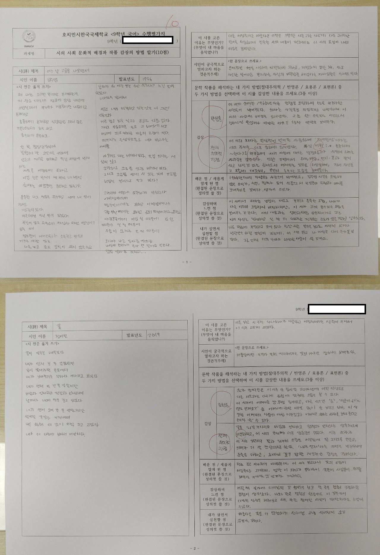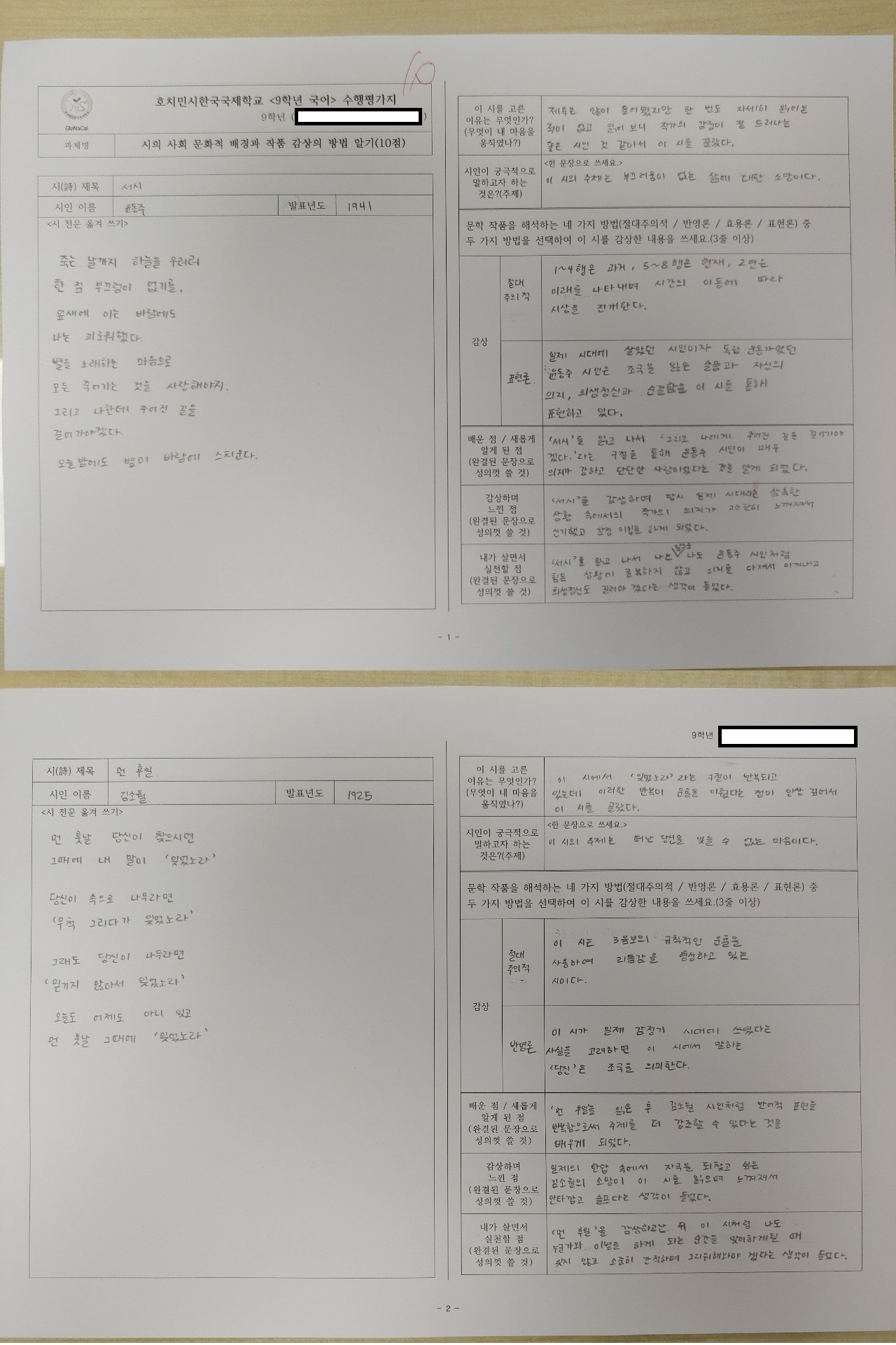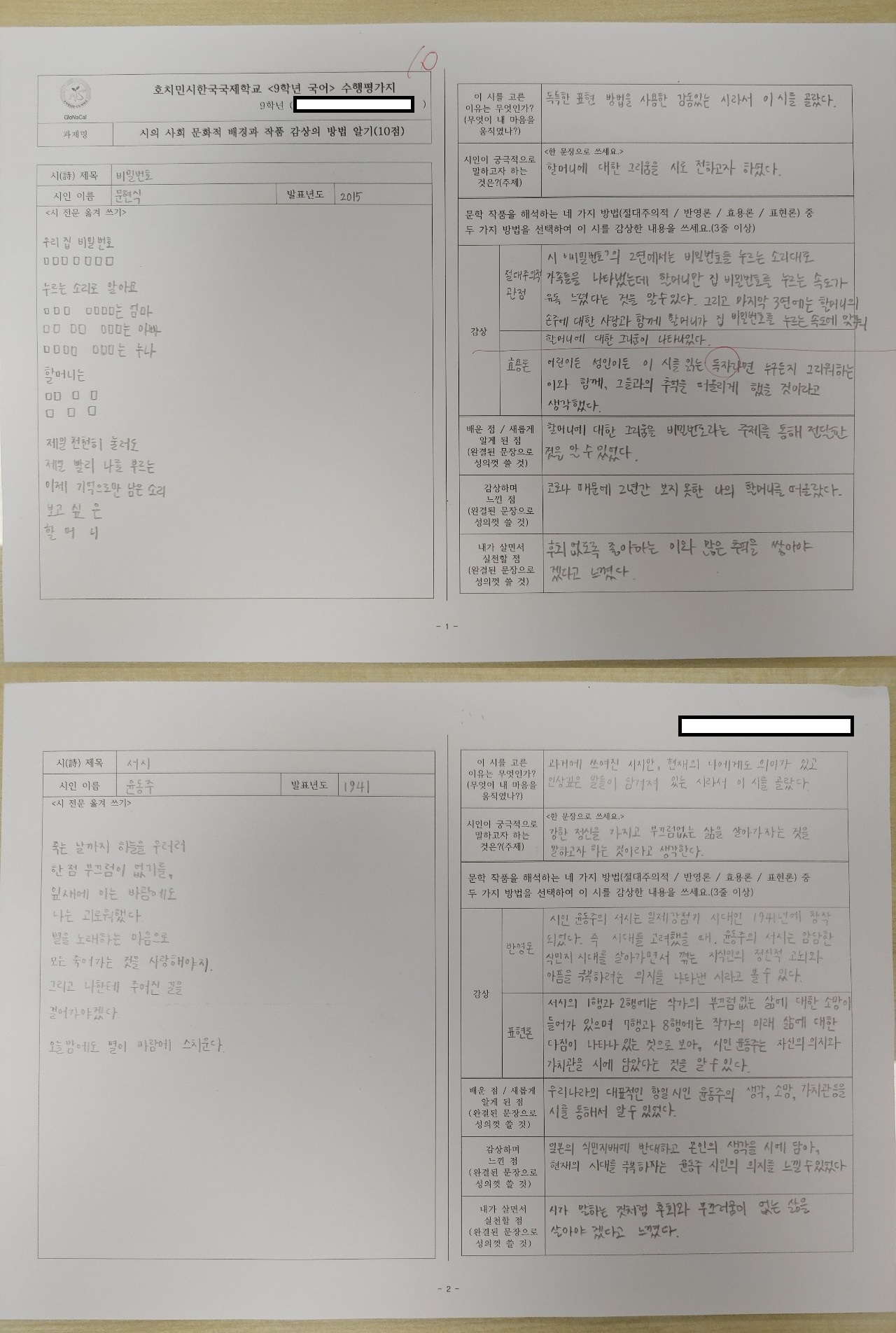 이후 (1) 시의 전문 옮겨 쓰기, (2) 고른 이유와 시의 주제 설명, (3) 문학 작품을 해석하는 네 가지 방법 중 두 가지를 이용하여 시 해석하기, (4) 배운 점, 느낀 점, 실천할 점 쓰기의 내용을 작성하게 합니다.