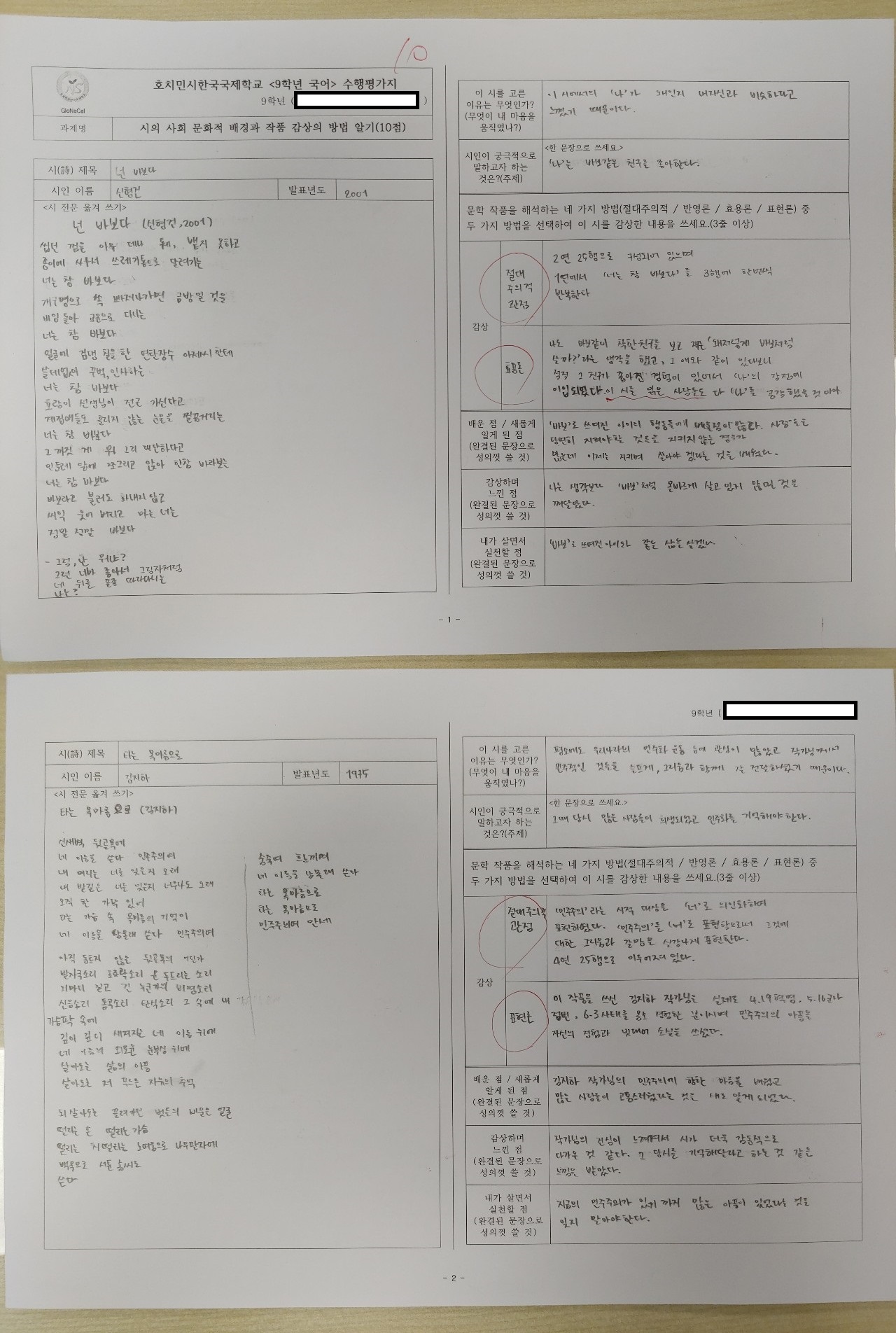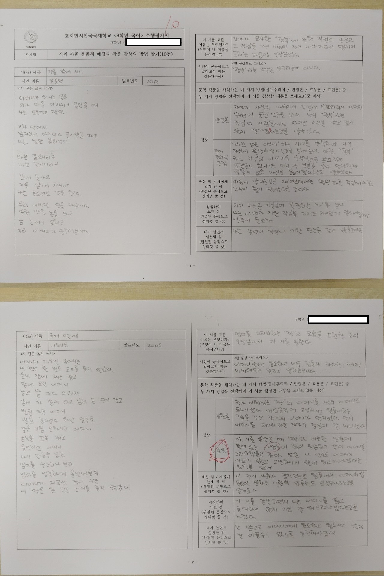 방법은 자료로 여러 가지 시를 나눠주고 마음에 드는 시 두 편을 고르게 합니다. 모두 23편의 시가 있는데, 일제강점기 창작된 이육사나 윤동주의 시부터 8학년 때 배웠던 시, 학생 작품 등 다양하게 제시하도록 노력했습니다.
