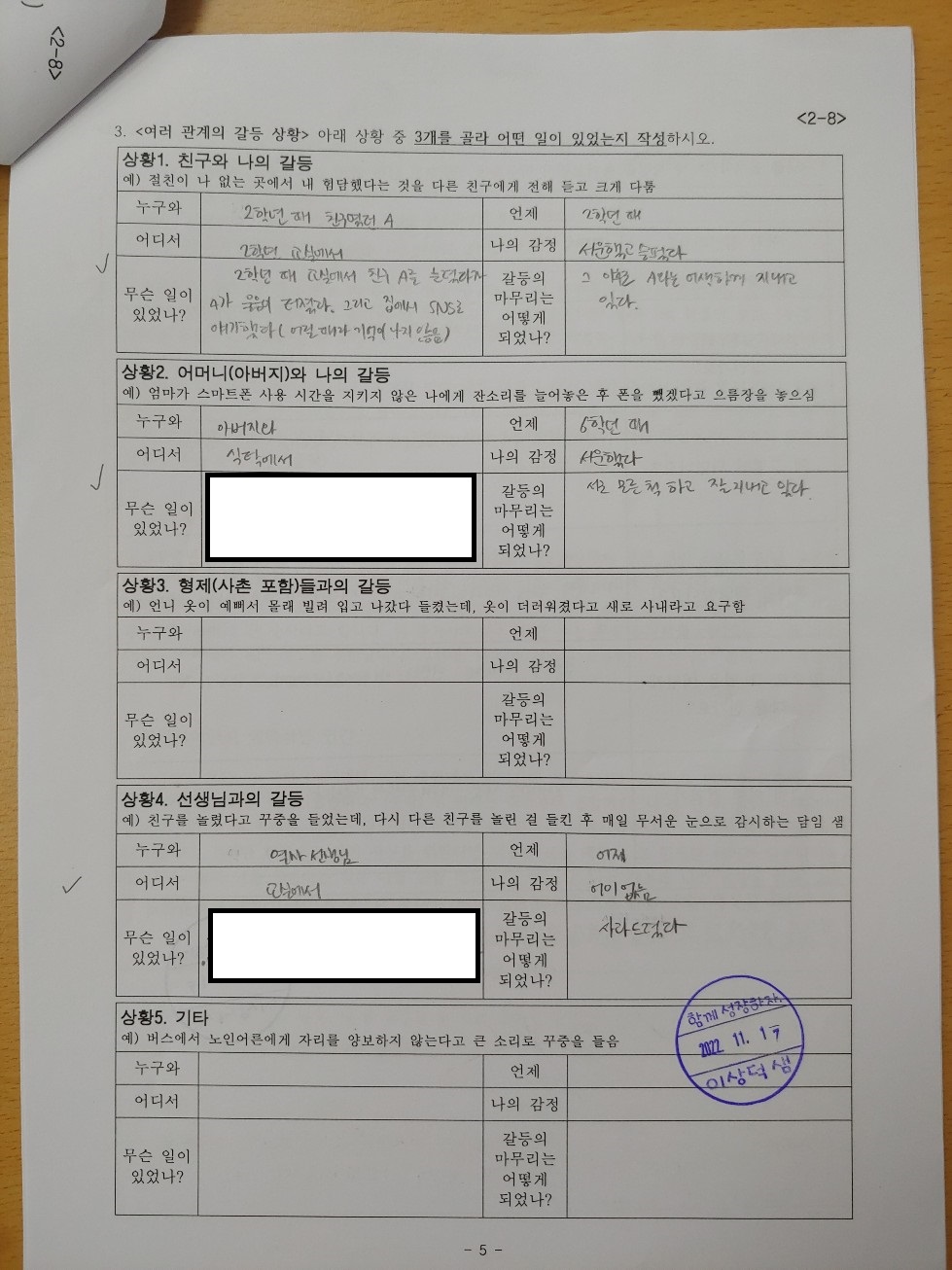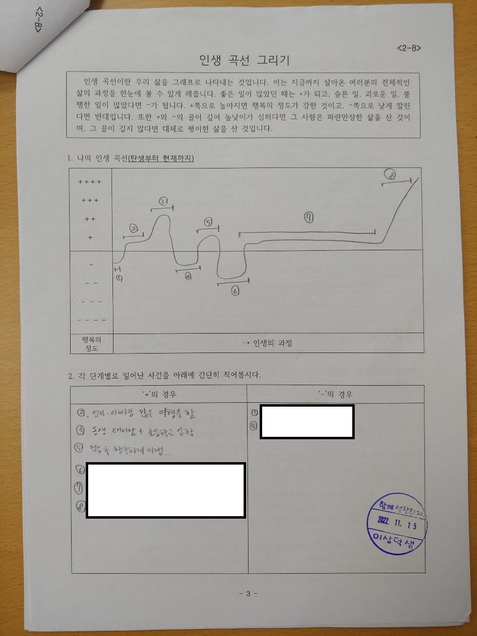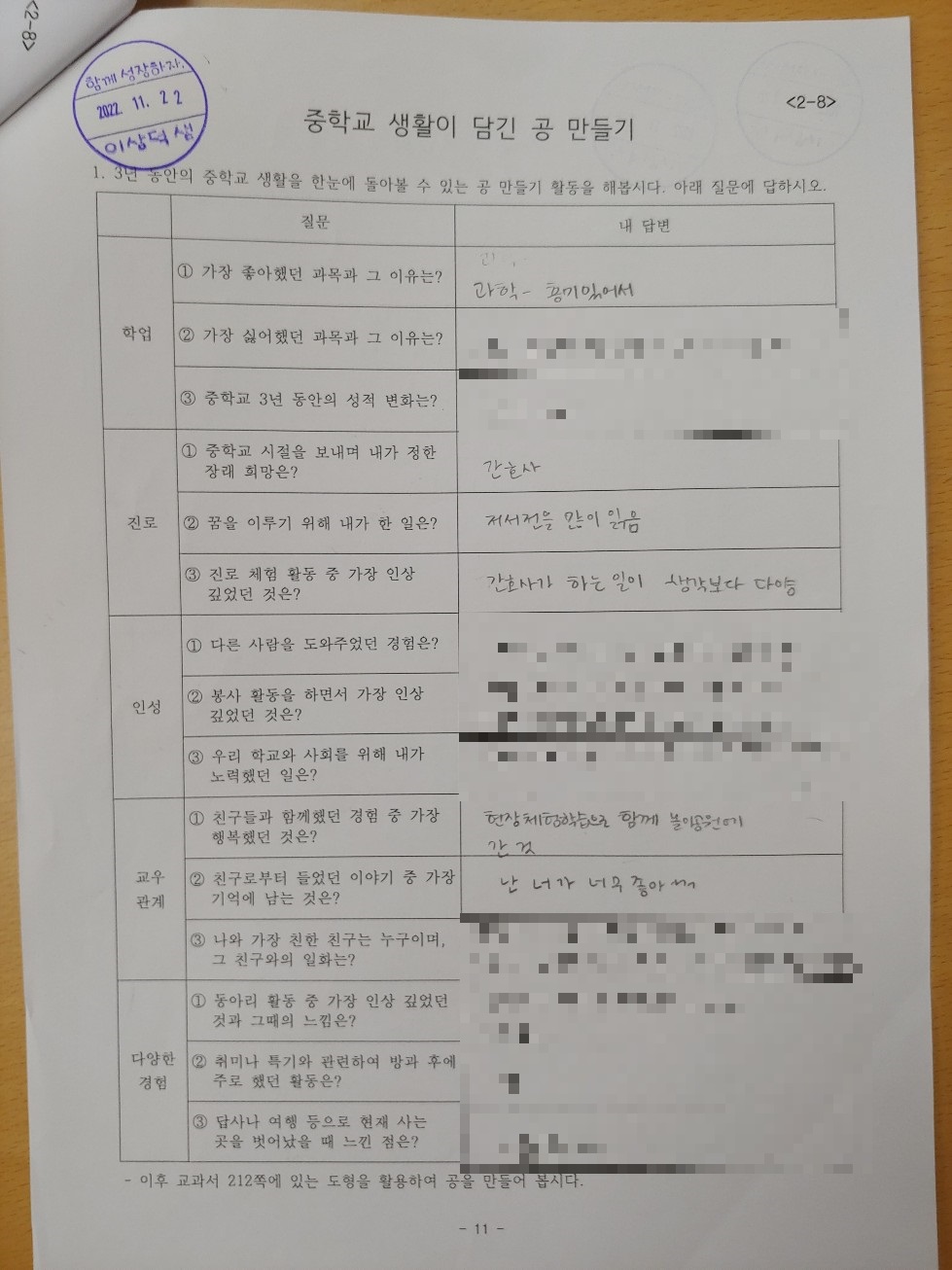민감한 내용이라 여기에 자료를 올리기는 어렵다. 아무튼 학생 개개인별로 첨삭을 해주느라 고생이 되기는 했지만 수행평가 결과나 점수를 인정하지 못하는 학생은 없었다. 앞으로 수업 시간에 자기소개서 쓰기를 또 수업할 일이 있을지 모르겠다.