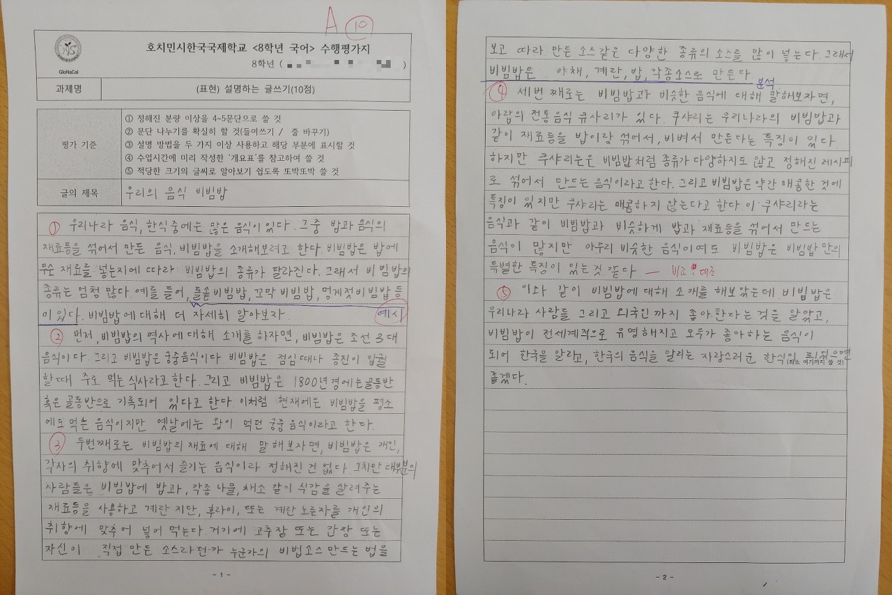 다양한 설명 방법을 배운 후, 그것을 활용하여 실제 설명하는 글을 쓰는 수행평가를 실시했습니다.