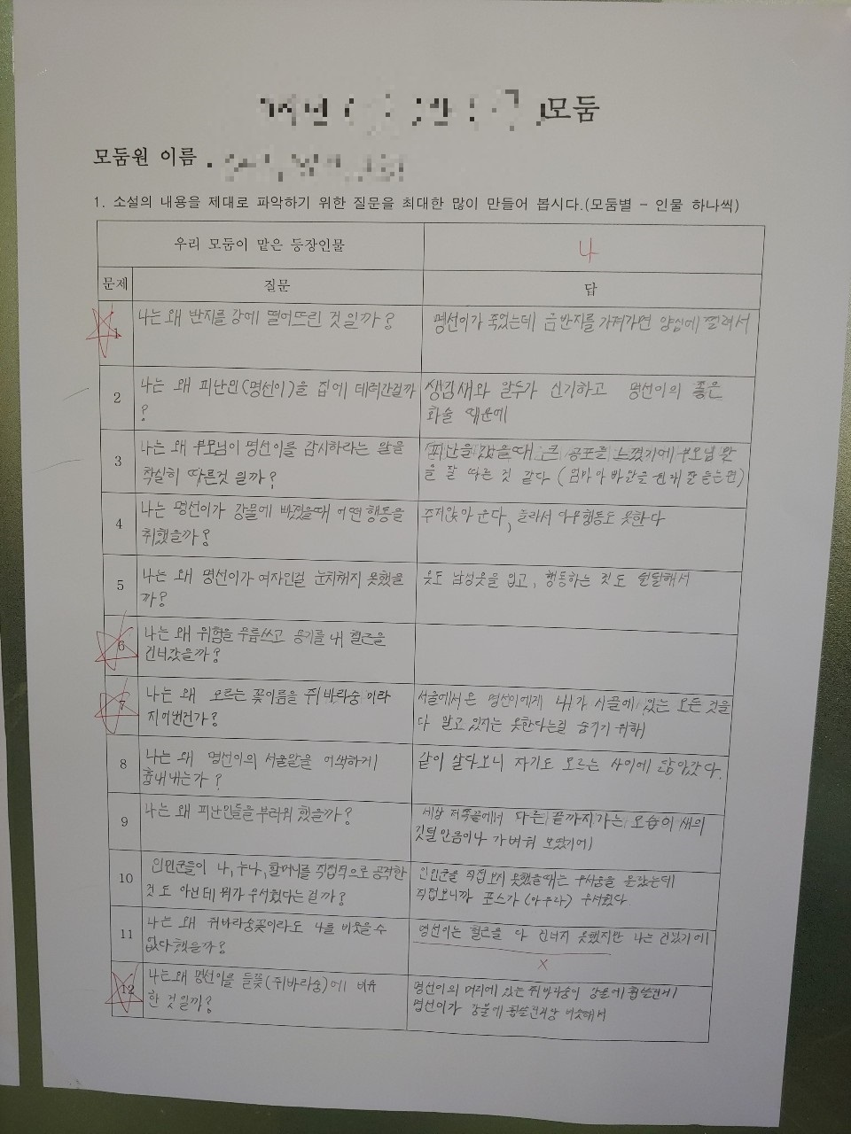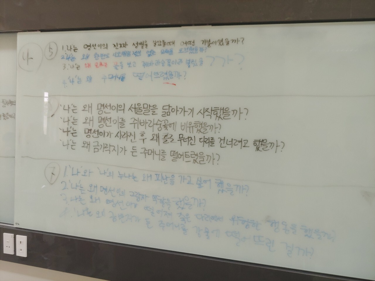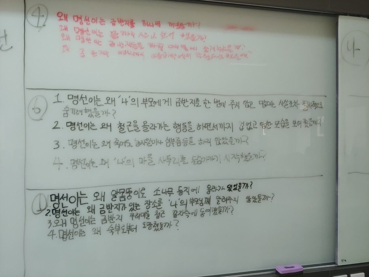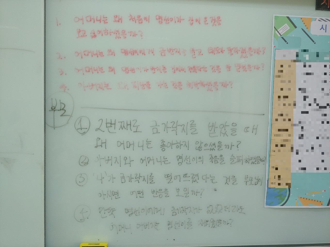 (3) 이후 <명선이>, <나>, <아버지/어머니> 이렇게 세 인물군으로 나누고 모둠별로 한 인물군을 맡게 하여, 내용 파악을 위한 질문 만들기와 답 찾기 활동을 함 - 공유를 위해 모둠별로 칠판에 쓰고 묻고 답하기 - 결과물은 복도에 게시