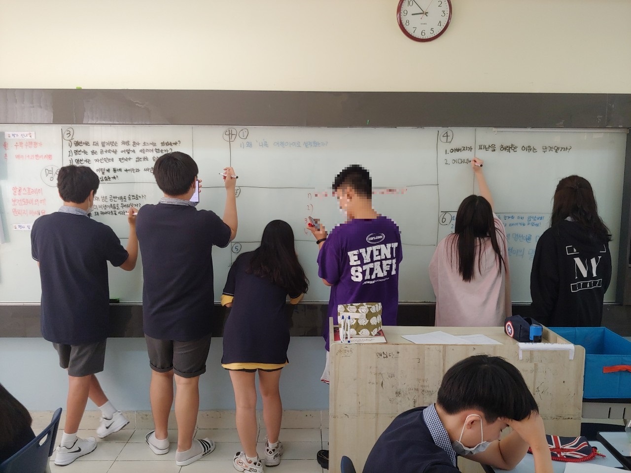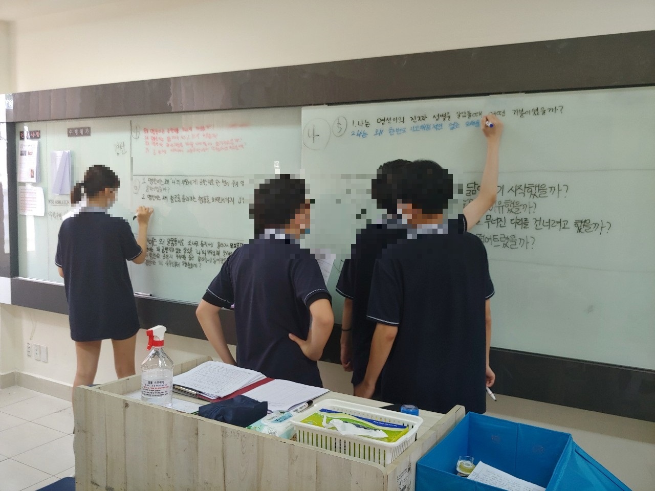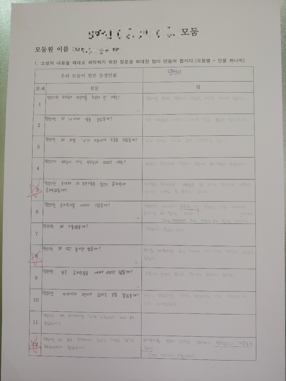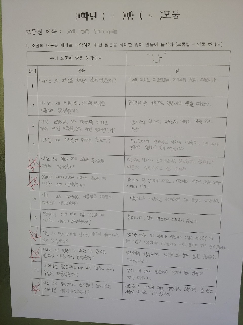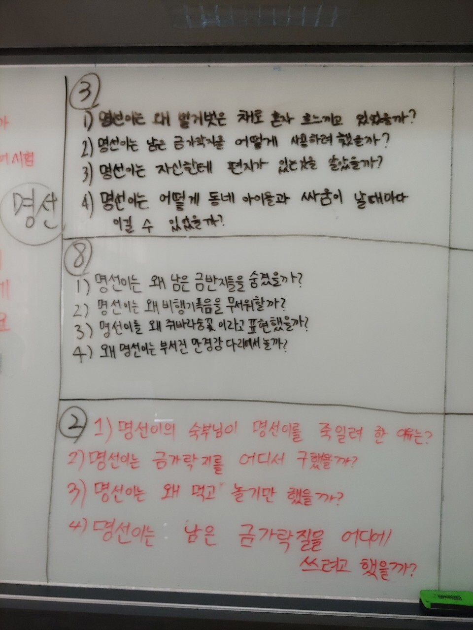 (3) 이후 <명선이>, <나>, <아버지/어머니> 이렇게 세 인물군으로 나누고 모둠별로 한 인물군을 맡게 하여, 내용 파악을 위한 질문 만들기와 답 찾기 활동을 함 - 공유를 위해 모둠별로 칠판에 쓰고 묻고 답하기 - 결과물은 복도에 게시