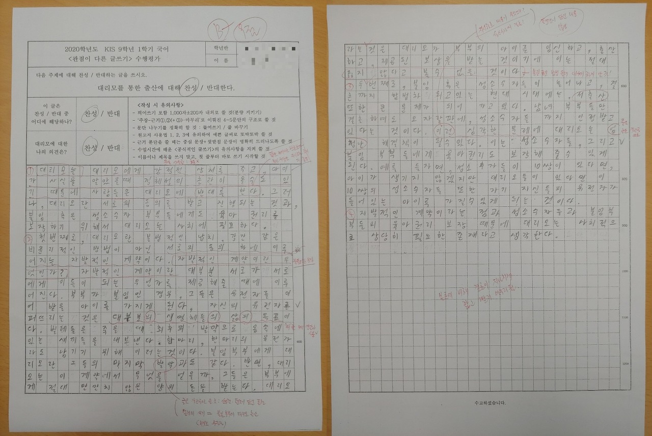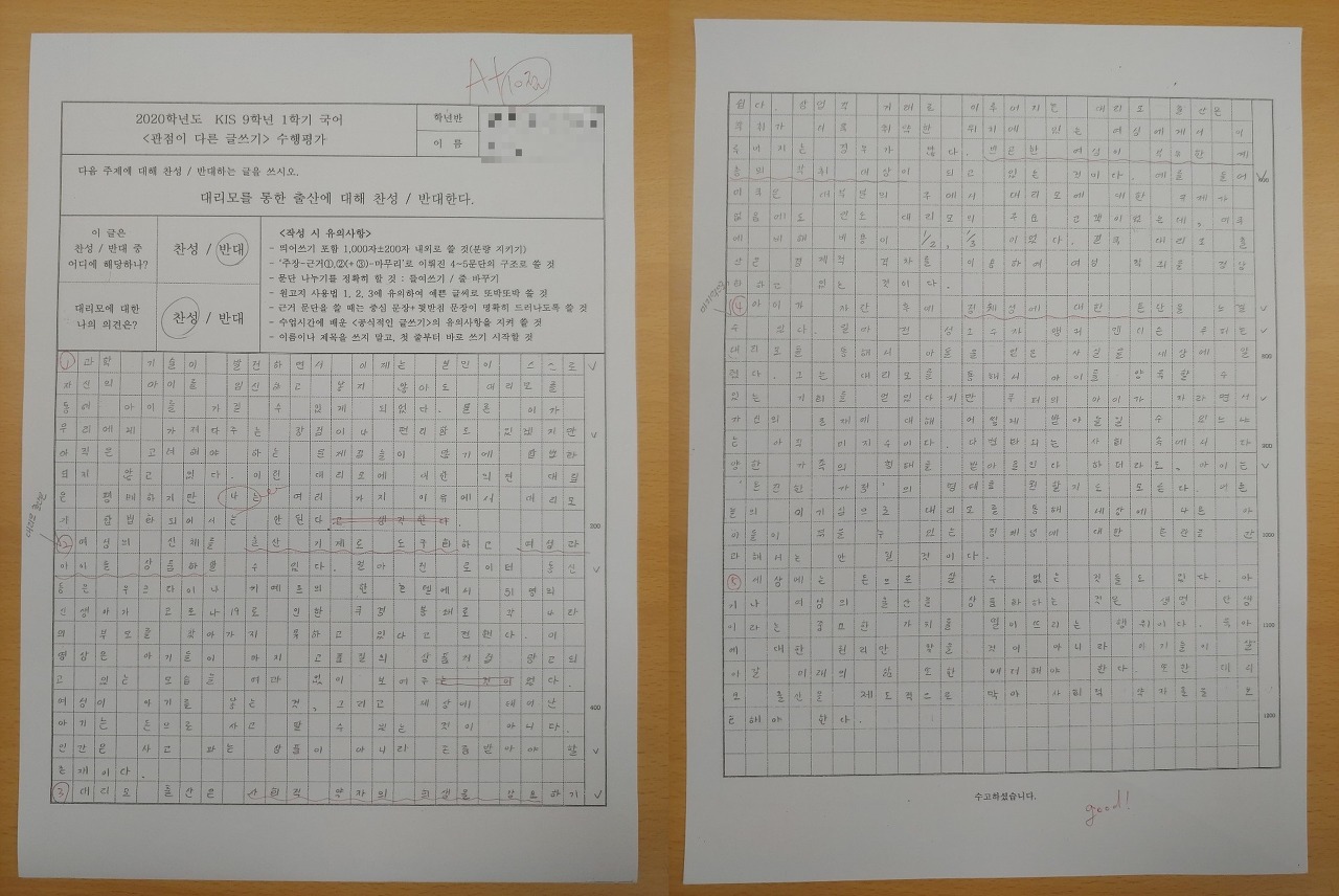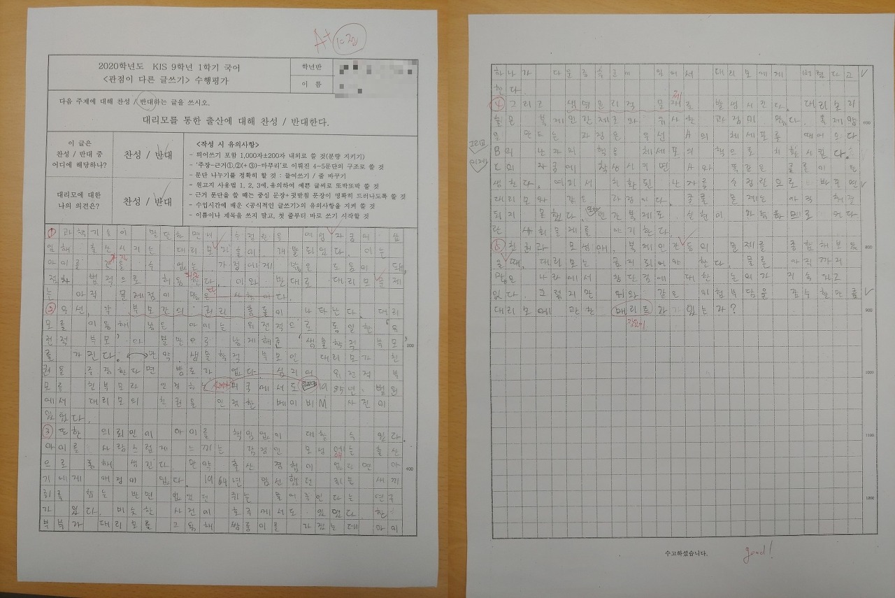 작성한 개요표를 바탕으로 찬성 한 시간, 반대 한 시간의 시간을 주고 5문단의 주장하는 글을 쓰도록 했습니다. 공식적인 글을 위한 문장 쓰기, 원고지 사용법을 공부하고, 근거들도 모둠 활동, 발표 등을 통해 공유했음에도 불구하고 글쓰기에 어려움을 겪는 학생들도 있었습니다. 반대로 주어진 조건에 맞도록 꽤 근사한 글을 쓴 학생들도 있었습니다.