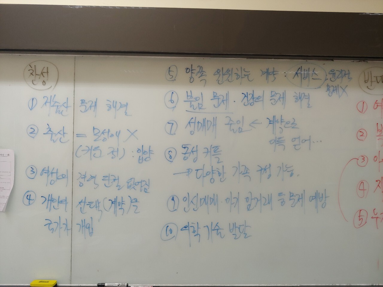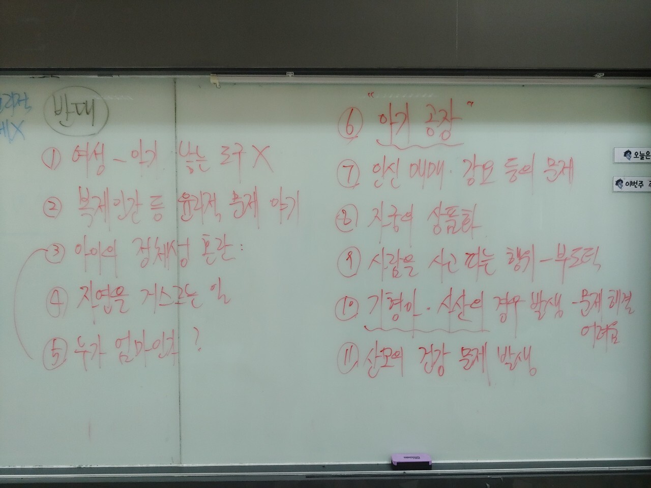 이후 모둠이 돌아가며 자신들이 생각한 근거들을 발표하여 칠판에 모두 정리했습니다. 그것들을 바탕으로 '찬성'과 '반대'의 근거를 세우고 각각 개요표를 작성하게 했습니다.
