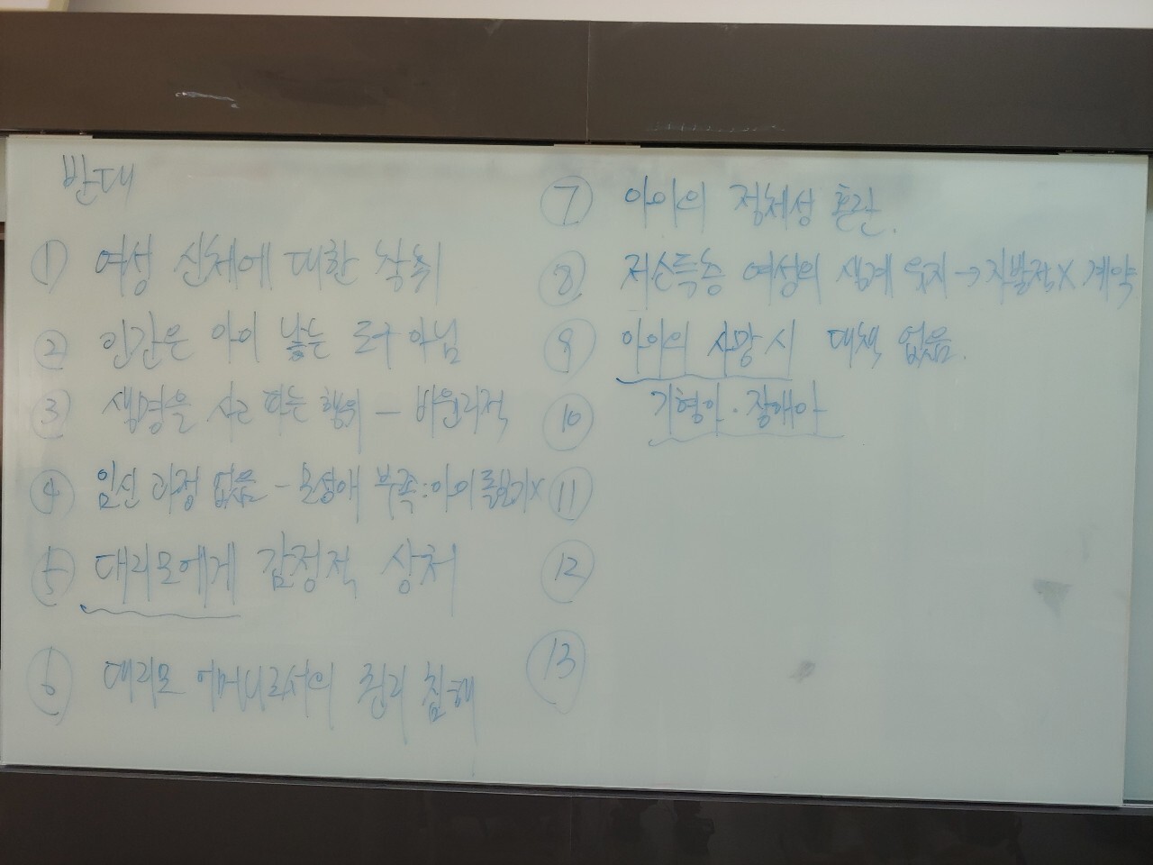 이후 '대리모' 문제에 대한 다양한 읽기자료를 나눠주고, 모둠별로 찬성과 반대의 논리를 찾아보게 했습니다. 성 역할과 빈부 격차, 종교적 신념을 포함한 차별의 문제와 다양하게 얽히는 주제로 찬반 의견이 갈렸는데 가능한 많은 근거들을 찾아보게 했습니다. 안타깝게도 아직 중학생이라 그런지 좀더 포괄적이고 설득력 있는 근거를 찾는데 어려움을 겪었습니다.