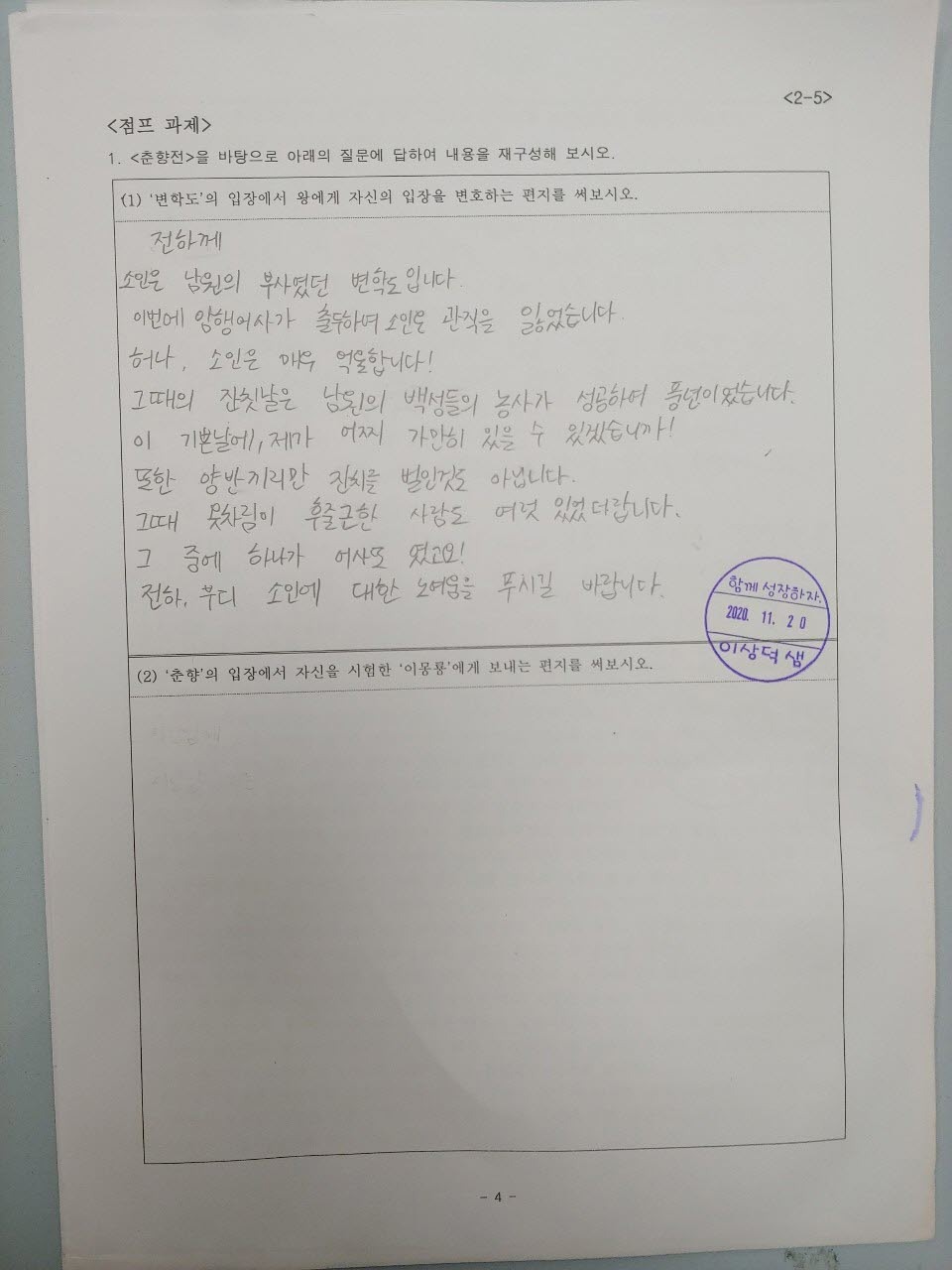 2. <춘향전> 관련 점프 과제 : 다른 등장인물 입장에서 편지 쓰기 / 결말 바꿔쓰기 등