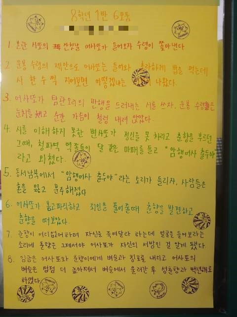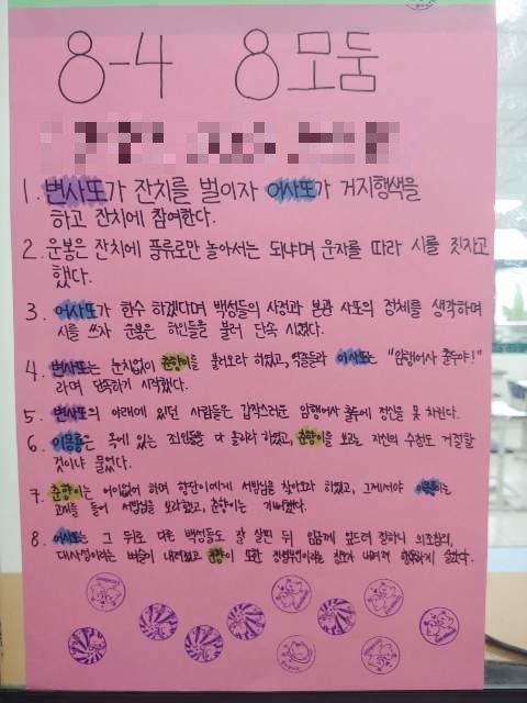 개인별 요약 - 모둠이 함께 색지에 요약 - 모두 벽에 붙인 후, 모둠별로 나가서 다른 모둠 요약문 읽기 - 잘한 모둠에 도장 주기(1인당 2개 모둠에 / 자기 모둠에는 도장 주기 불가) - 가장 도장 많이 받은 모둠에 칭찬 도장