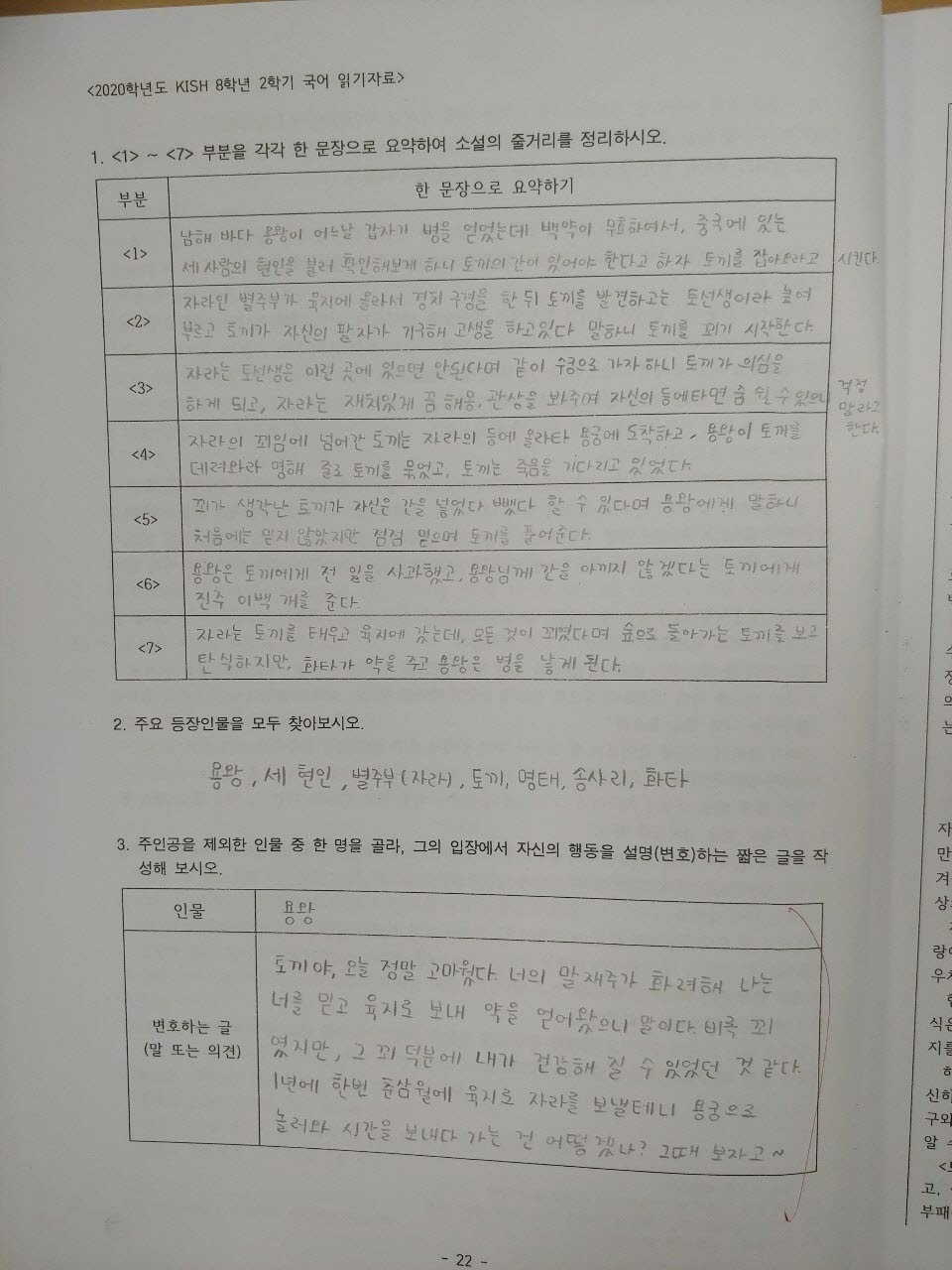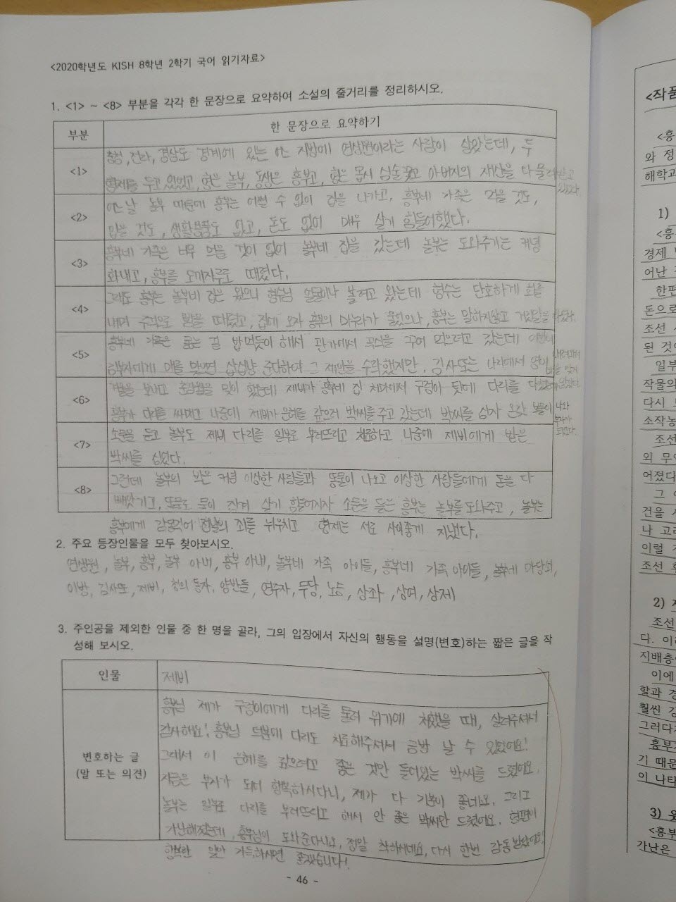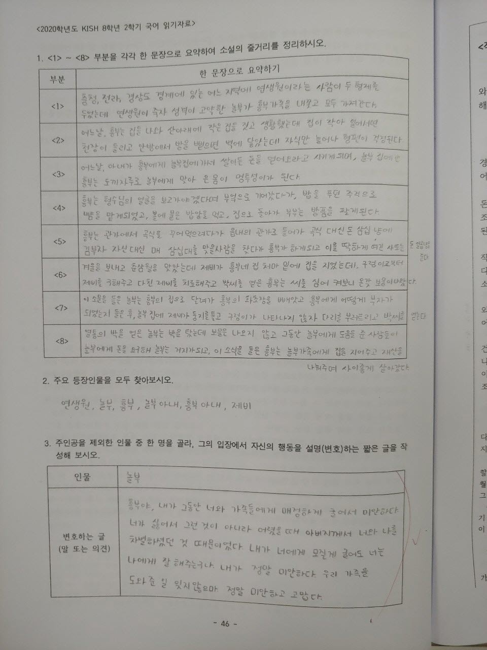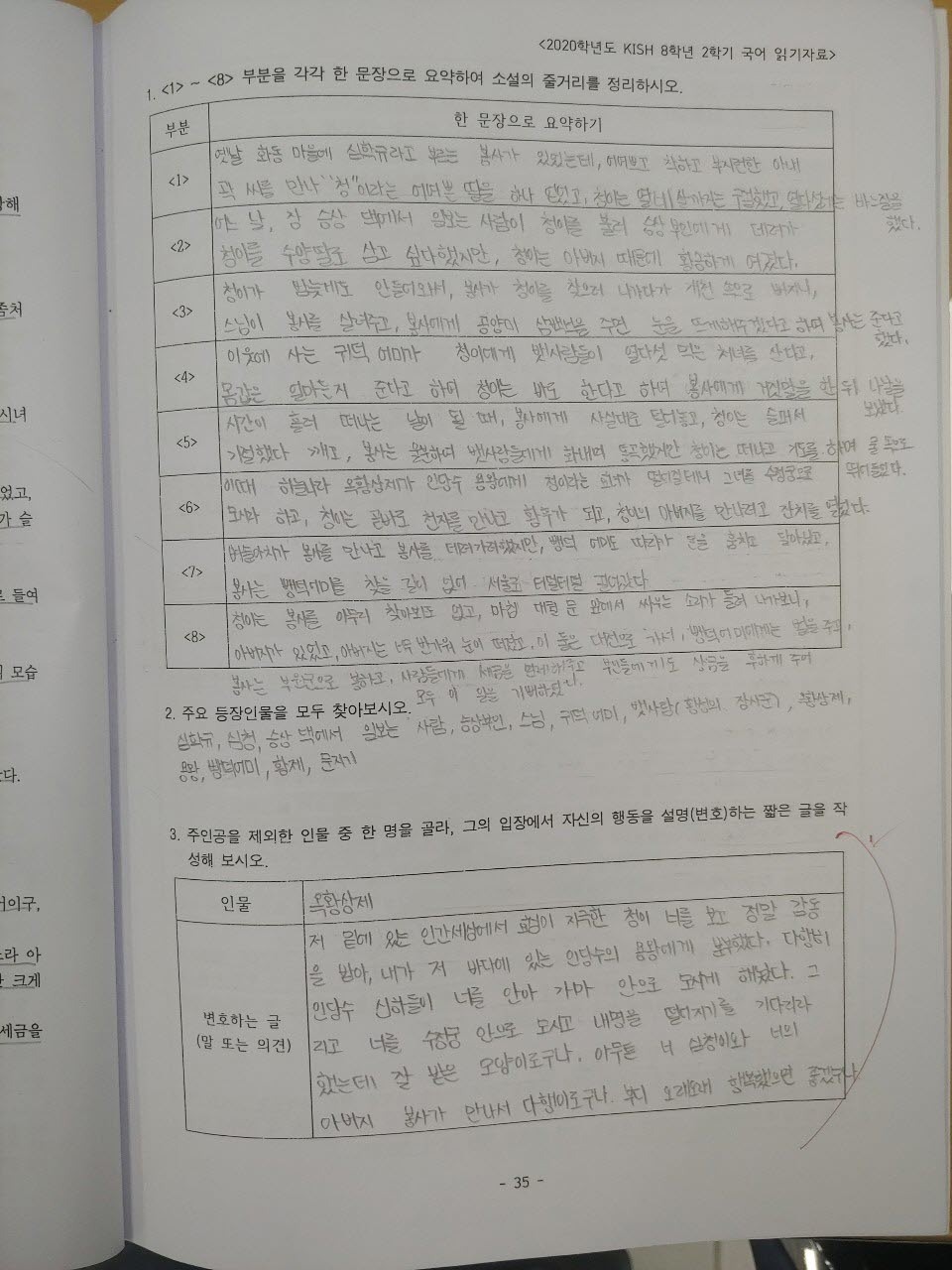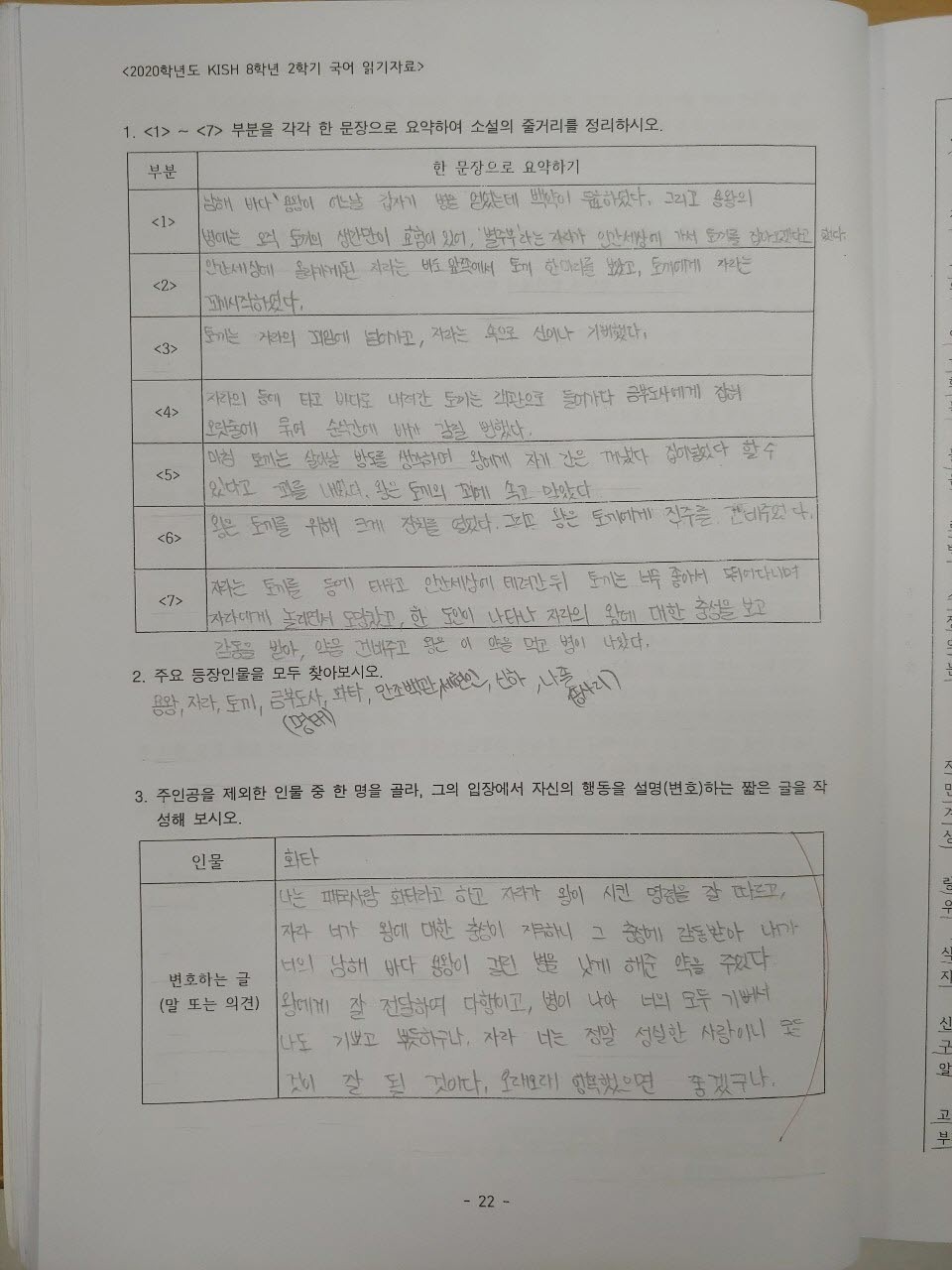 가능한 수행평가는 과제형으로 제시하지 않고 수업 시간에 다 하도록 하는 편이지만, 이 수행평가는 수업시간 4~5시간 정도를 할애하기는 했으나 시간 내에 못 읽은 부분은 과제형으로 해오도록 할 수밖에 없었습니다.