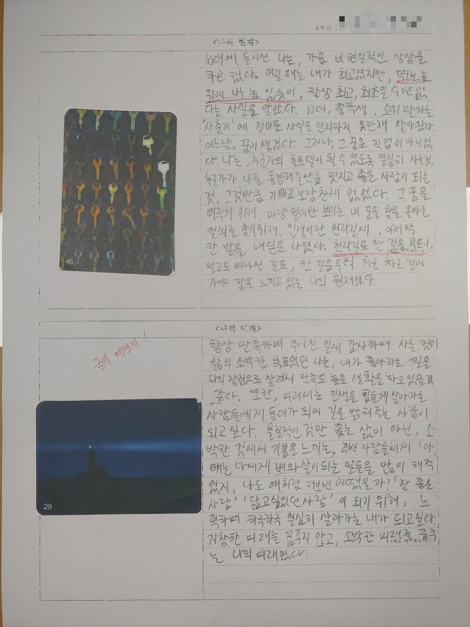 그냥 쓰면 어려워 하기 때문에 이미지 카드를 나눠 준 후, 자신의 과거-현재-미래와 연결되는 이미지를 골라 글을 쓰게 했습니다.